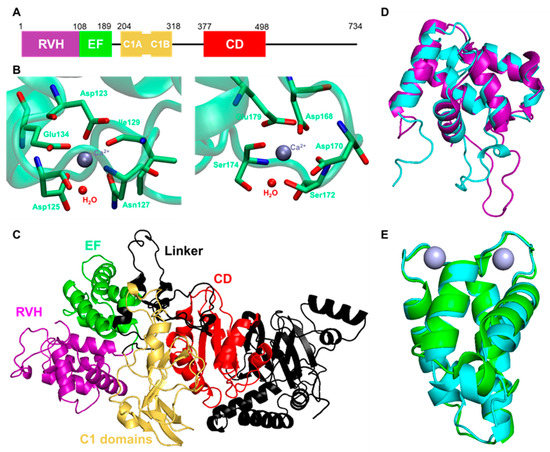 Furthermore, recent rapid evolution in the prediction of the protein structure by deep learning provides the predicted structure of DGKα by AlphaFold2, as shown in Figure 3C [116,117,118]. Notably, although the prediction scores of linker regions between each domain are not so high as predicting the orientation of these domains, the structure of each domain seemed to be reliable enough. Indeed, the predicted RVH domain and EF-hand motifs overlapped well with the experimental structures, and the root-mean-square deviations (RMSD) were 1.229 and 1.076 Å, respectively (Figure 3D,E). In other words, taking advantage of the predicted structure makes it possible to understand the molecular basis of DGKα activation more deeply.