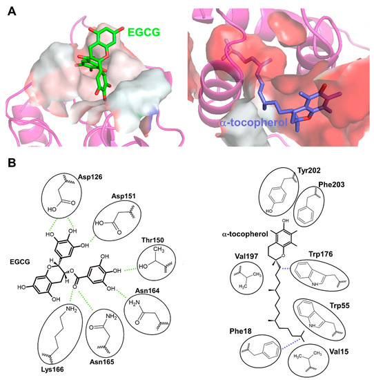 Hydrophobicity of the EGCG and α-tocopherol binding site of 67LR. (A) The amino acid residues of EGCG and the α-tocopherol binding site of 67LR are shown as surfaces colored by hydrophobicity (white: hydrophilic, red: hydrophobic. Green: EGCG, Blue: α-tocopherol). (B) The 2D binding mode of EGCG and α-tocopherol in each binding site. The 2D images are generated based on the binding mode of EGCG and α-tocopherol [133]. Green dashed lines indicate hydrogen bonds, and blue dashed lines indicate arene-hydrogen interactions with circled amino acids.