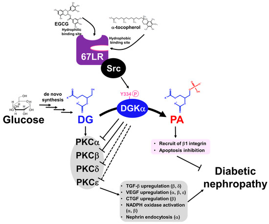 Under hyperglycemic conditions, high blood glucose results in DG accumulation via de novo synthesis. The accumulation of DG abnormally activates PKCs, and the enhanced PKC pathways are one of the mechanisms for the development and progression of DN. PKC activation promotes biological changes leading to DN, such as growth factor expression followed by extracellular matrix production and oxidative stress (Figure 5). DGK is an enzyme that can inhibit PKC activity by converting DG into PA. So far, many studies have supported the idea that DGKα ameliorates DN by inhibiting abnormal activation of PKCs and by activating PA signaling (Figure 5). Notably, since DGKα activation can inhibit several PKC subtypes simultaneously, DGKα activation may be more effective than specific PKC inhibitors. So far, it has been proven that two food factors, α-tocopherol, and EGCG, ameliorated DN through DGKα activation in murine studies. Importantly, EGCG showed a positive effect on DN in humans, suggesting that EGCG is a functional food for DN by activating DGKα, although there are several issues, such as toxicity of EGCG for medical purposes. Therefore, the development of an effective DGKα activator is still needed.
