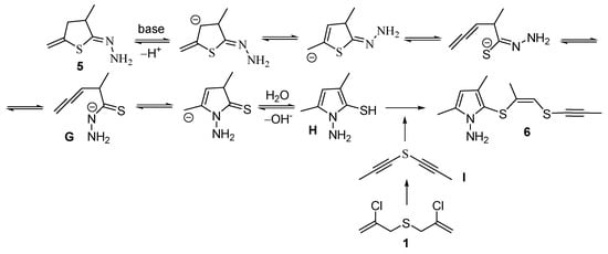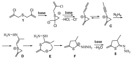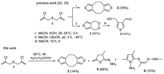 3.2. Procedures for the Synthesis and Characterization Data for 4,5,9,10-Tetrahydrothieno [3’,4;5,6]cycloocta [1,2-c]thiophene (2), (Z)-1-(3-Methyl-5-Methylenedihydrothiophene-2(3H)-ylidene)hydrazine (5), and (Z)-3,5-Dimethyl-2-(1-(prop-1-ynylthio)prop-1-ene-2-ylthio)-1H-pyrrole-1-amine (6)