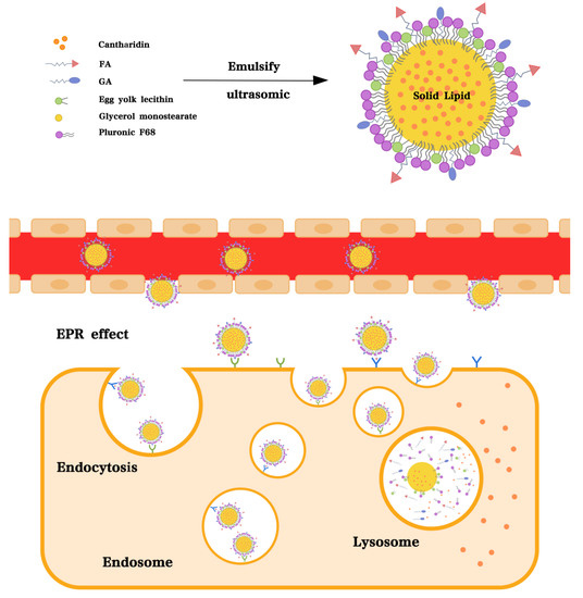 Cantharidin was obtained from Xi’an Tongze Biotechnology Co., Ltd. (Xi’an, China). GA was synthesized in our Laboratory (Hunan University of Chinese Medicine, China). FA was obtained from Shanghai Pengshuo Biotechnology Co., Ltd. (Shanghai, China). Egg yolk lecithin was supplied by Lipoid Brand (Köln, Germany). Glycerol monostearate was received from Hengxin Chemical Reagent Co., Ltd. (Shanghai, China). Pluronic F-68 was purchased from Source Leaf Biology Co., Ltd. (Shanghai, China). Dialysis bag (MWCO 8000–14,000 Da) was bought from Beijing Dingguo Changsheng Biotechnology Co., Ltd. (Beijing, China). MTT was obtained from Biosharp (Hefei, China). Annexin V-FITC/PI Apoptosis Detection Kit was purchased from Becton, Dickinson and Company (Franklin Lakes, NJ, USA).