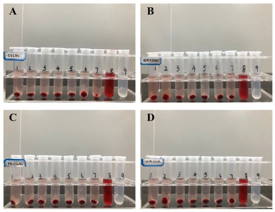 Hemolysis assessment of SLNs (A) CSLNs; (B) GA-CSLNs; (C) FA-CSLNs; and (D) GA-FA-CSLNs.