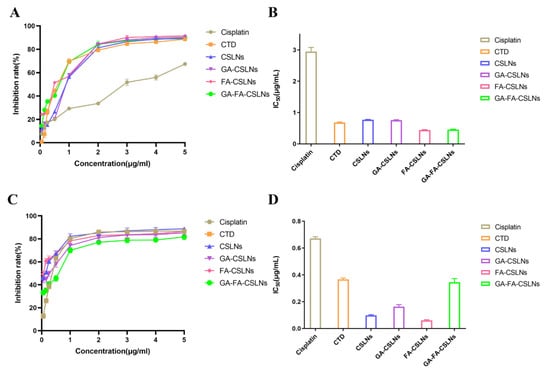 The IC50 values of the four SLNs to HepG2 and L-02 cells are summarized in Figure 5. The IC50 values for L-02 cells were much lower than those for HepG2 cells. In addition, the IC50 values of the four SLNs were lower than those of the CTD solution group, indicating that the nanoparticles could be better absorbed by cells. Results indicated that both CSLNs and modified CSLNs effectively inhibited the proliferation of HepG2 and L-02 cells, and the inhibitory effect of GA-FA-CSLNs on HepG2 cells was stronger than that of other SLNs.