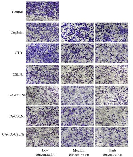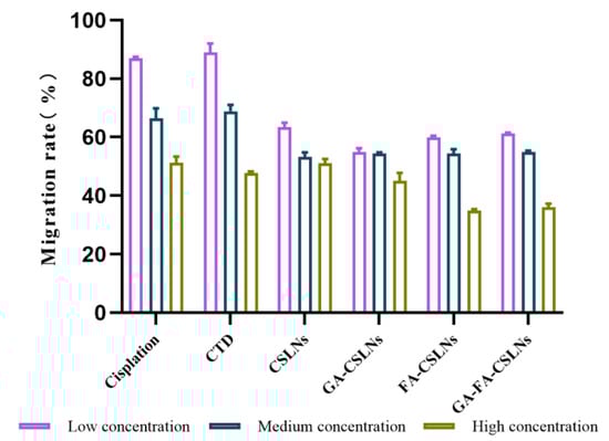 The results revealed that, compared with the CTD solution and cisplatin group, the four CTD-loaded SLNs had a stronger inhibitory effect on the migration of HepG2 cells that was dose-dependent.
