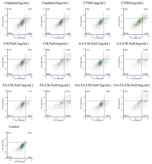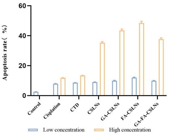 In this study, flow cytometry was used to detect the effect of the four CTD-loaded SLNs (CSLNs, GA-CSLNs, FA-CSLNs, and GA-FA-CSLNs) on the apoptosis of HepG2 cells, as shown in Figure 8 and Figure 9. Compared to the blank control, the apoptosis rate of all drug groups was slightly increased (approximately 10%) at low concentrations, while at high concentrations, the cell apoptosis rates of the four CTD-loaded SLNs were significantly higher than those of the CTD solution and cisplatin group at high concentrations. Treatment at 0.6 µg/mL induced a further increment of early apoptotic, late apoptotic, and early necrotic cell populations, suggesting that the fraction of apoptotic cells varied with the SLN concentration in a dose-dependent manner. Moreover, at the same concentration, the apoptosis rate of HepG2 cells treated with FA-CSLNs or GA-CSLNs was higher than that of those treated with GA-FA-CSLNs, which may be because GA could trigger protective autophagy in HepG2 cells [42]. In conclusion, an increased dose of drug-loaded SLNs resulted in a substantial increment in late apoptotic/early necrotic cell populations.