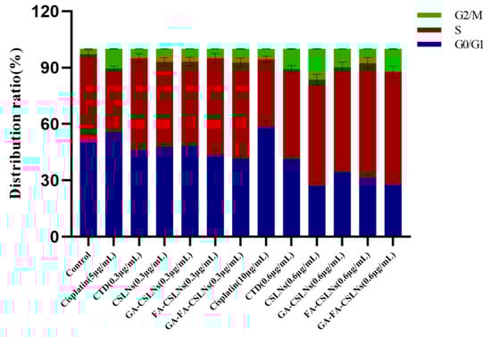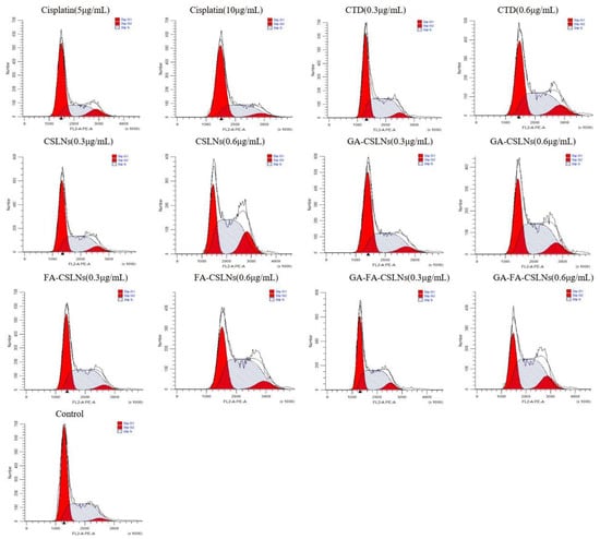 Next, we examined the effects of the four CTD-loaded SLNs (CSLNs, GA-CSLNs, FA-CSLNs, and GA-FA-CSLNs) on the cell cycle using flow cytometry, as shown in Figure 10 and Figure 11. For the CTD solution group, the percentage of cells in the G2/M phase increased compared with the blank control, suggesting cell cycle arrest in the G2/M phase. For the four CSLNs, the percentage of cells in the S and G2/M phases increased significantly compared with the blank control in a dose-dependent manner, indicating that the cell cycle was mainly arrested in the S and G2/M phases. Among them, CSLNs mainly blocked the cell cycle in the G2/M phase while GA-CSLNs, FA-CSLNs, and GA-FA-CSLNs mainly blocked the cell cycle in the S phase, suggesting that the CSLNs modified by the GA and/or FA ligand can inhibit DNA synthesis and promote cell apoptosis. For the cisplatin group, cell cycle arrest was in the G2/M phase at low concentrations and in the G0/G1 phase at high concentrations.