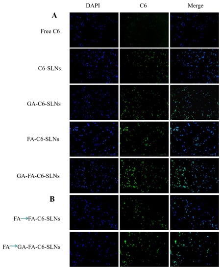 Fluorescence microscopy was used to investigate the qualitative uptake of SLNs modified with C6 by HepG2 cells. The cell uptake experiment consisted of five groups, C6, C6-CSLNs, GA-C6-CSLNs, FA-C6-CSLNs, and GA-FA-C6-CSLNs, and two concentrations of C6 (40 μg/mL, 80 μg/mL) for each group. The specific procedure was as follows: HepG2 cells (1 × 105/well) at logarithmic growth stage were incubated in 24-well cell culture plates and cultured for 24 h. In the cell uptake experiments, 1 mL of SLNs was added to the plates and cultured at 3 °C for 4 h; however, in the competition inhibition test group, serum-free DMEM medium containing FA ligands (0.5 mg/mL) was added for incubation for 2 h, then supernatant was discarded, followed by the addition of 1 mL of FA-C6-CSLNs or GA-FA-C6-CSLNs of culture for 2 h. Afterwards, the cells were fixed with 75% ethanol solution for 10 min, stained with 150 μL of 200 ng/mL DAPI for 15 min, and then washed three times with PBS. Finally, cells were observed under fluorescence microscopy.