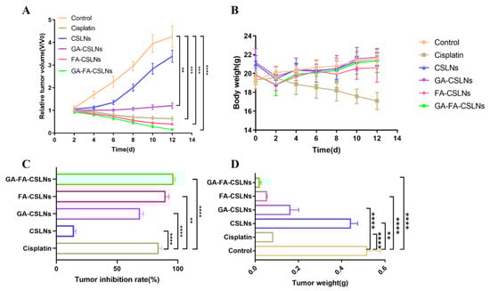 In vivo pharmacodynamic evaluation index of CSLNs (A) relative tumor volume; (B) body weight; (C) tumor inhibition ratio; (D) tumor weight. Date is presented as the mean ± SD (n = 6). ** p < 0.01, *** p < 0.001, and **** p < 0.0001.