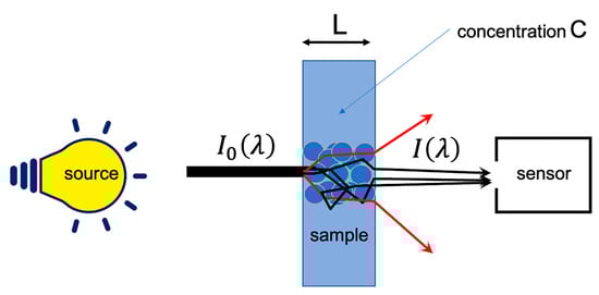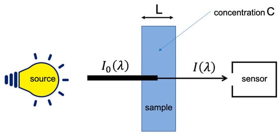 When electromagnetic radiation passes through a material medium, it undergoes several phenomena, including absorption. When the radiation is in the NIR range, this absorption is caused mainly by the bonds of nonsymmetrical molecules, including carbon, oxygen, hydrogen and nitrogen. This is why NIR spectroscopy is used in analytical chemistry of biological compounds. When a sample is measured under ideal conditions, i.e., in transmission, at low concentration of the analyte(s) of interest and without light scattering, Beer–Lambert law applies (see Figure 1 and Equation (1)).