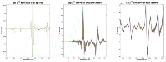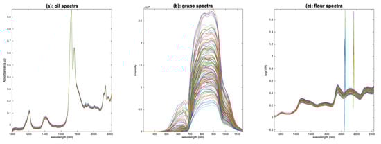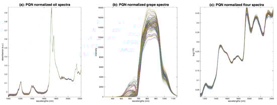 Figure 13a–c show the results of normalization by the norm for the three sets of spectra. The effect on the oil spectra (Figure 13a) is almost nonexistent, because these spectra contain no multiplicative effects. The application on the grape spectra is spectacular. The visible part of the spectrum, from 400 to 700 nm, shows several groups of different colors (with peaks at 550 nm or 600 nm), which corresponds well to the ground truth (i.e., different grape varieties). The VNIR part, from 700 to 1150 nm, is much less impacted by the multiplicative effect, although there is still some left. The peak at 960 nm, due to water, now appears more clearly. The flour spectra (Figure 13c) have also benefited from this normalization. The spectra are now much more clustered.