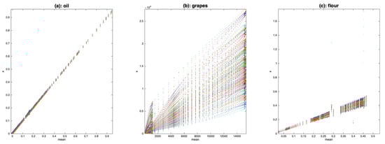 Scatter plot of the spectra as a function of the mean spectrum for (a): oil data, (b): grape data, (c): flour data.