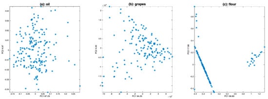 Scatter plot of the two first scores of a PCA calculated on (a): oil spectra, (b): grape spectra, (c): flour spectra.