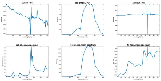 Loadings of a PCA calculated on (a): oil spectra, (b): grape spectra, (c): flour spectra, and mean spectra of (d): oil, (e): grape and (f): flour.