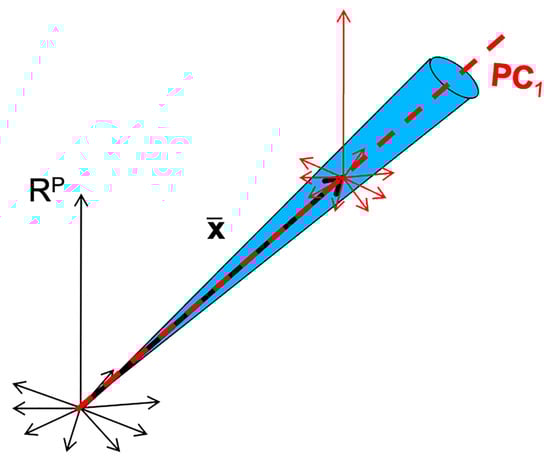 Multiplicative scatter correction (MSC) [21] proposes explicitly correcting each spectrum of a set of spectra with respect to a reference spectrum . The idea is to remove from each spectrum the additive and multiplicative effects that distinguish it from and, thus, to align all the spectra on a common global direction. In practice, as is often unknown, it is usually replaced by the average of . Concretely, using the point of view of Figure 4, the following model is written: