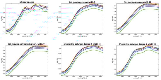 Examples of flour spectra in the wavelength range 2245–2368 nm. (a): Raw spectra, (b): spectra smoothed by a moving window average, width 5, (c): spectra smoothed by a moving window average, width 11, (d): spectra smoothed by a moving polynomial fitting, degree 1, width 11, (d): spectra smoothed by a moving polynomial fitting, degree 1, width 11, (e): spectra smoothed by a moving polynomial fitting, degree 2, width 11, (f): spectra smoothed by a moving polynomial fitting, degree 5, width 11.