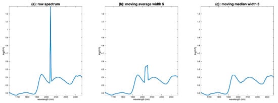 A special case of noise is in the form of peaks affecting a single wavelength, as in the example of flour spectra (Figure 3c). These peaks can originate from dead pixels in hyperspectral cameras. The elimination of such noise cannot be conducted using classical methods, such as moving averages. Instead, a median filter is used, which simply consists of replacing the value of the point i of the spectrum by the median of its neighbors. Figure 9a shows one spectrum of the flour database. We notice an intense spike around 2050 nm. Figure 9b shows the result of a moving average filtering on a window of five points. We can see that the filtering did not work because the noise is not zero mean. Figure 9c shows the result with a moving median filtering. The result is much better.