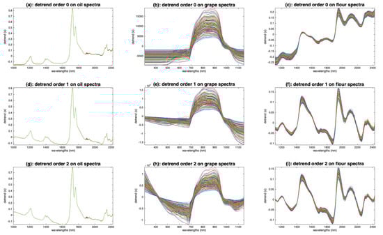 Illustration of the detrending preprocessing. (a,d,g): Oil spectra, (b,e,h): grape spectra, (c,f,i): flour spectra after median filtering (w = 3). (a–c): Order 0, (d–f): order 1 and (g–i): order 2.