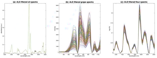 Illustration of asymmetric least squares filtering. (a): Oil, (b): grapes, (c): flour.