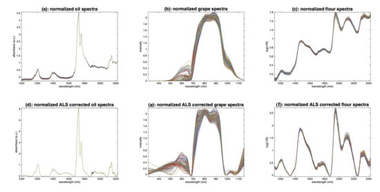 The explanations given, especially by Equation (4), assume that the spectra are free of additive effects. Figure 13d–f show the results of the normalization on the three sets of spectra after application of the ALS filter. It can be seen in Figure 13d that normalization did not alter the oil spectra, which were already near perfect after ALS filtering. On the other hand, the grape spectra, which were highly altered by ALS filtering (Figure 12b), do not give a good result after normalization. Finally, the application of normalization on the ALS-filtered flour spectra (Figure 13f) shows interesting results. The intensity variations that remained on the ALS-filtered spectra (Figure 12c) were significantly reduced. However, it can be seen that variations remain in areas where no chemical absorption takes place, such as between 1300 and 1400 nm. This can be explained by the fact that the spectrum norm, which is used in the normalization procedure, contains chemical information and is, therefore, not the best candidate for the function . To avoid this problem, several methods have been proposed [17,18,19]. They all consist of estimating a function related as much as possible to the multiplicative effect, and as little as possible to the chemistry of the sample.