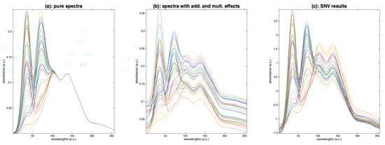 SNV is a very popular method in the NIR community; the paper describing this method has been cited more than 3400 times in about 30 years. The reason for such success is that the method is simple and effective in removing most of the variability due to scattering, which is unavoidable in case of backscatter measurements. It is widely used as a preprocessing for linear model calibrations, such as PLS regression. However, when the goal is to recover fundamental spectral components, such as pure spectra, as with in Equation (1), or to recover an accurate level of absorbance, this preprocessing can be detrimental, as shown in the following example.