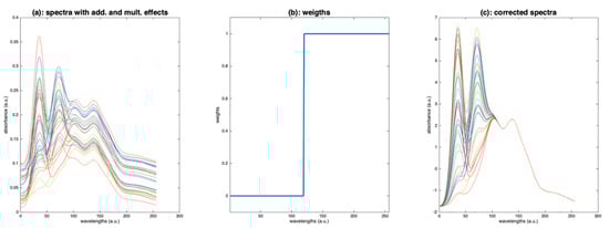As an example, Figure 16c shows the result of a weighted SNV, using the weights plotted in Figure 16b. The result is perfect, because the additive and multiplicative effects have been estimated using the part of the spectra affected only by these effects.