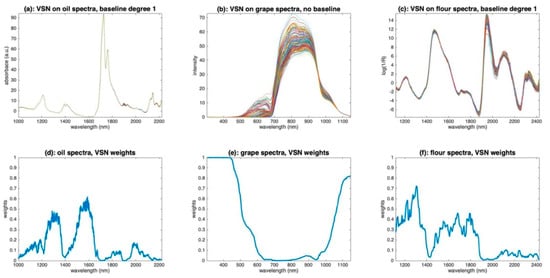 Figure 17 illustrates the application of VSN to the three sets of oil, grape and flour spectra. Figure 17a–c show the corrected spectra; Figure 17d–f show the weights found by the algorithm. For the oil spectra, VSN retained baselines of degree 1 and calculated the weights plotted in Figure 17d. These weights are overall low, indicating that all wavelengths are mostly related to chemistry. The two least informative areas, and, therefore, the most efficient for calculating additive and multiplicative effects, are the two dips around 1300 and 1500 nm. The resulting spectra reported in Figure 17a are very similar to those yielded by a detrending of order 1 (Figure 10d). For the grape spectra, VSN has identified that only multiplicative effects exist. The weights (Figure 17e) are very contrasting. They are very close to 1 at both ends of the spectral range, i.e., before 500 nm and after 1100 nm, and close to 0 in the 550–1000 nm region, which corresponds well to the region of pigments and metabolic compounds. The resulting spectra (Figure 17b) are quite similar to those obtained with PQN (Figure 14b). This illustrates that, when the spectra are only impacted by multiplicative effects, VSN and PQN are, in fact, two very close solutions to achieve a robust normalization. For the flour spectra, VSN found a model with baselines of degree 1, which corresponds to the result found after applying detrending (Figure 10). The weights (Figure 17f) show that the areas around 1400 nm and above 2000 nm should not be used for the calculation of multiplicative and additive effects. This result is consistent with the absorption areas of O-H bonds (water, cellulose) and proteins. The preprocessed spectra (Figure 17c) globally resemble those obtained with detrending (Figure 10). However, in detail, it can be seen that the area from 1900 nm to 2500 nm was less shrunk by the preprocessing than the rest of the spectrum, suggesting that variations due to chemistry are visible in this area.