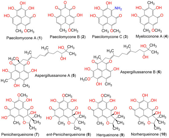 - Harman, R.E.; Cason, J.; Stodola, F.H.; Adkins, A.L. Structural features of herqueinone, a red pigment from Penicillium herquei. J. Org. Chem. 1955, 20, 1260. [Google Scholar] [CrossRef]