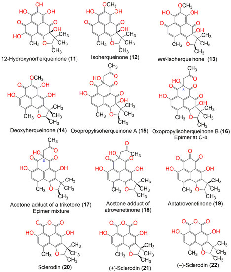 Eleven metabolites of the herqueinone subclass, including six new derivatives, ent-peniciherqueinone (8), 12-hydroxynorherqueinone (11), ent-isoherqueinone (13), oxopropylisoherqueinones A (15) and B (16), and 4-hydroxysclerodin (27) and the known analogs, 9, 12, 17, 22, and 34 were extracted from a marine-derived Penicillium sp. (Figure 2). The new metabolites’ configuration was assigned, based on specific rotations and chemical modifications. Compound 17 exhibited moderate anti-inflammatory activity (IC50 3.2 µM) towards mouse macrophage RAW 264.7 cells, compared to AMT (IC50 0.2 µM) in the nitric oxide synthase assay. In addition, 27 exhibited moderate anti-angiogenic potential (IC50 20.9 µM) toward HUVECs (human umbilical vascular endothelial cells), compared to sunitinib (IC50 1.5 µM), in the tube formation assay. Furthermore, 8 and 12 moderately induced adipogenesis (IC50 57.5 and 39.7 µM, respectively) in the hBM-MSCs (human bone marrow-mesenchymal stem cells), compared to pioglitazone (IC50 0.69 µM), in the adiponectin production assay [35].