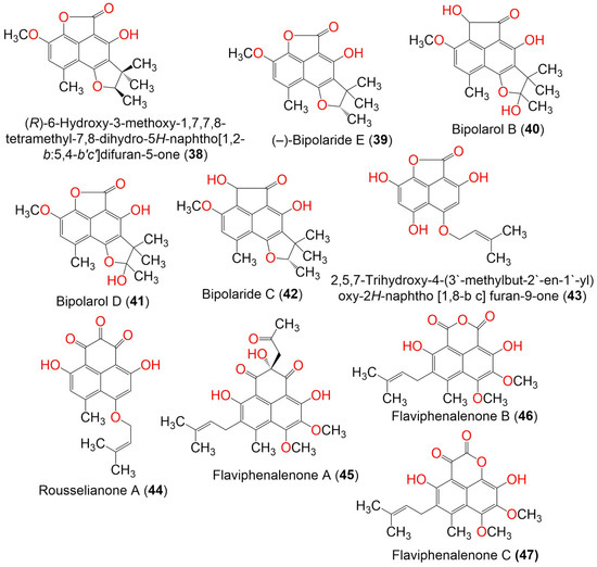 Zhang et al. purified new derivatives, flaviphenalenones A–C (45–47), from solid cultures of Aspergillus flavipes PJ03-11 (Figure 4). The 6S absolute configuration of 45 was determined by the computational ECD method. Compound 47 was a positional isomer of 46. They represented the first report of phenalenones with a directly connected C-10 isoprene unit, whereas 47 had a keto-lactone group at C-8. Compounds 46 and 47 possessed potent α-glucosidase inhibitory potential (IC50s 94.95 and 78.96 µM, respectively) than acarbose (IC50 685.36 µM). On the other hand, 45 displayed significant cytotoxic capacities toward MCF-7 and A549 (IC50 10.0 and 6.6 µg/mL, respectively) compared to doxorubicin (IC50 0.4 and 0.2 µg/mL, respectively), while 47 showed moderate cytotoxicity toward A549 (IC50 28.5 µg/mL) [31].