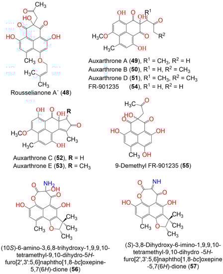 Auxarthrones A–E (49–53) and FR-901235 (54) were obtained from the culture of the coprophilous fungus Auxarthron pseudauxarthron TTI-0363 (Figure 5). Compounds 52 and 53 possessed an unusual 7a,8-dihydrocyclopenta[a]phenalene-7,9-dione ring system. Compound 49 was separated into a mixture of racemic diastereomers; their structures were confirmed by X-ray crystallography. Compounds 49 and 51 showed moderate antifungal potential toward C. albicans and C. neoformans (MICs 6.4 and 3.2 μg/mL, respectively), compared to amphotericin B (MIC 0.8 μg/mL). The other phenalenones were weakly active (MIC ranging from 6.4 to 51.2 μg/mL). On the other hand, they showed no significant cytotoxic effects against MDA-MB-451 and MDA-MB-231 [48].