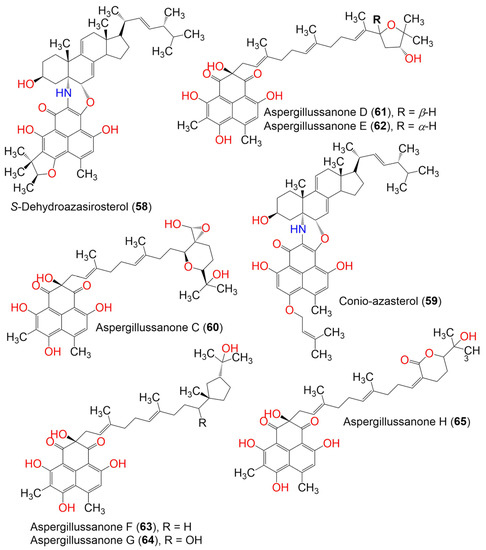 Compound 56 obtained from the marine-derived endophytic fungus, Coniothyrium cereale, harboring the Baltic Sea algae Enteromorpha sp., which had unprecedented imine functionality between two carbonyls to produce an oxepane-imine-dione ring. It exhibited a moderate cytotoxic potential toward the SKM1, U266, and K562 cancer cell lines (IC50s 75.0, 45.0, and 8.5 µM, respectively) in the MTT assay [37]. The new phenalenone derivatives, aspergillussanones C–L (60–69), along with the known analog 70, were isolated from the solid culture of Aspergillus sp. that was associated with Pinellia ternate (Figure 6 and Figure 7).
