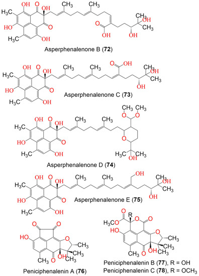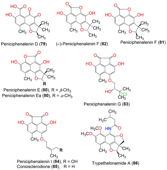 The new derivatives, peniciphenalenins A–F (76–81), along with the formerly reported 21, 28, and 33, were obtained from Penicillium sp. ZZ901 culture, using ODS and HPLC (Figure 9). Their structures were determined by extensive spectroscopic analysis, ECD calculation, optical rotation, and single X-ray diffraction. The analyses identified a phenalenone skeleton, fused to a trimethyl-furan ring. Compounds 28 and 33 showed antimicrobial activity toward MRSA and E. coli (MICs 23–35 µg/mL for 28 and 7.0–9.0 µg/mL for 33). On the other hand, 21, 28, and 33 showed weak antiproliferative activity against the glioma cells (IC50 23.24–6.93 µM), compared to doxorubicin (IC50 1.2 and 0.47 µM, respectively) [39].