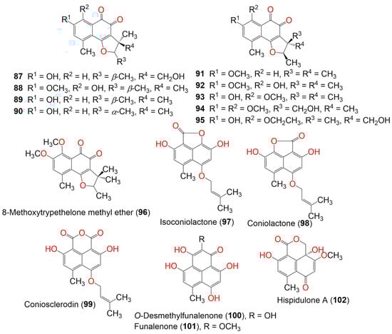 Two new metabolites, 8-methoxytrypethelone (93) and 5′-hydroxy-8-ethoxytrypethelone (95), along with compounds 20, 38, 89, 91, 92, and 94 were separated from mycobiont culture of Trypethelium eluteriae by preparative TLC and column chromatography. They were fully characterized by using spectroscopic, ECD, and X-ray analyses. Compound 89 (MIC 12.5 µg/mL) showed potent antimycobacterial potential toward M. tuberculosis, followed by 38 and 94 (MIC 50.0 µg/mL). Moreover, 89 had moderate potential (MIC 25.0 µg/mL) toward M. chitae, M. szulgai, M. phlei, M. flavescens, M. parafortuitum, and M. kansasii. In addition, compounds 89 and 94 were active versus S. aureus (MIC 25 µg/mL) [41]. Funalenone (101) was also purified as a PTP inhibitor from a marine-derived fungal strain of Aspergillus sp. SF-5929 and was tested for its inhibitory potential on hPTP1B1-400 in a photocolorimetric assay using the hPTP1B1 enzyme. It exhibited powerful PTP1B inhibitory potential (IC50 6.1 µM), compared to ursolic acid (IC50 4.3 µM). It was found that 101 was a noncompetitive PTP1B inhibitor that targeted the active or allosteric site of the enzyme [53]. Chaetosphaeronema hispidulum yielded two new phenalenones, hispidulones A (102) and B (103), which were assigned by spectroscopic and ECD analyses (Figure 11).