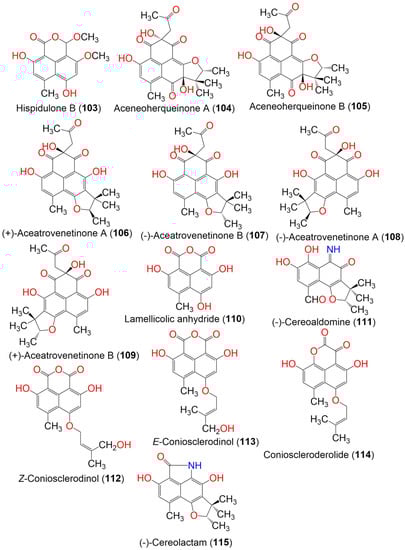 Aceneoherqueinones A (104) and B (105), (+)-aceatrovenetinone A (106), and (+)-aceatrovenetinone B (109), along with the known congeners, (+)-scleroderolide (33), (−)-scleroderolide (34), (−)-aceatrovenetinone B (107), and (−)-aceatrovenetinone A (108), were reported from the marine mangrove-derived fungus, Penicillium herquei MA-370. Among these, compounds 104 and 105 were rare phenalenones, having a cyclic ether unit between C-2′ and C-5 (Figure 11). Compounds 106–109 were unstable stereoisomers, possessing configurationally labile chiral centers that were characterized by HPLC-ECD analyses, assisted by TDDFT-ECD calculations. The absolute configuration of 104 was confirmed by X-ray, while those of 105–109 were established by ECD spectra TDDFT-ECD calculations. Compounds 104 and 105 displayed ACE (angiotensin-I-converting enzyme) inhibitory activity (IC50s 3.10 and 11.28 μM, respectively), compared to captopril (IC50 9.23 nM). The molecular docking study revealed that compound 104 bound well with ACE via hydrogen interactions with the residues Gln618, Ala261, Asn624, and Trp621, while 105 interacted with the Tyr360 and Asp358 residues. This difference in interactions was likely caused by the C-8 epimerization of both compounds [46].