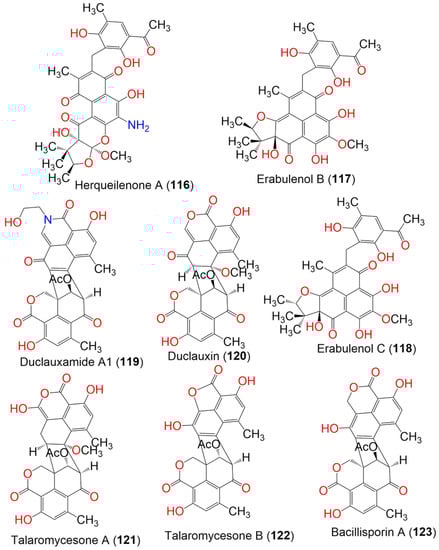 Duclauxamide A1 (119), a new polyketide heptacyclic-oligophenalenone dimer with an N-2-hydroxyethyl moiety, was isolated from Penicillium manginii YIM PH30375, which is associated with Panax notoginseng. It belongs to the 9′S-duclauxin epimers, based on spectroscopic data analysis, single-crystal X-ray diffraction, and the computational 13C NMR-DFT method. It is structurally related to duclauxin (120), showing the replacement of the O-atom with the N-containing chain, without modification, on the original carbon skeleton. It showed moderate cytotoxicity toward MCF-7, SMML-7721, A-549, HL-60, and SW480 (IC50 ranged from 11 to 32 μM), compared to cisplatin and paclitaxel [56]. Two new oxaphenalenone dimers, talaromycesones A (121) and B (122), were isolated from the marine fungus Talaromyces sp. LF458 culture broth and mycelia. Their relative configuration was determined by NOESY spectral data. Compound 116 was the first metabolite with a 1-nor oxaphenalenone dimer framework. They exhibited significant antibacterial potential toward S. epidermidis and S. aureus (IC50s 3.70 and 5.48 μM, respectively, for 121, and 17.36 and 19.50, respectively, for 122), compared to chloramphenicol (IC50 1.81 and 2.46 μM, respectively) in the resazurin microplate assay. They revealed no antifungal effectiveness toward Trichophyton rubrum and C. albicans. Moreover, 121 exhibited AchE (acetylcholinesterase) inhibition (IC50 7.49 μM) that was more powerful than huperzine (IC50, 11.60 μM) in the modified Ellman’s enzyme/immunosorbent assay [59].