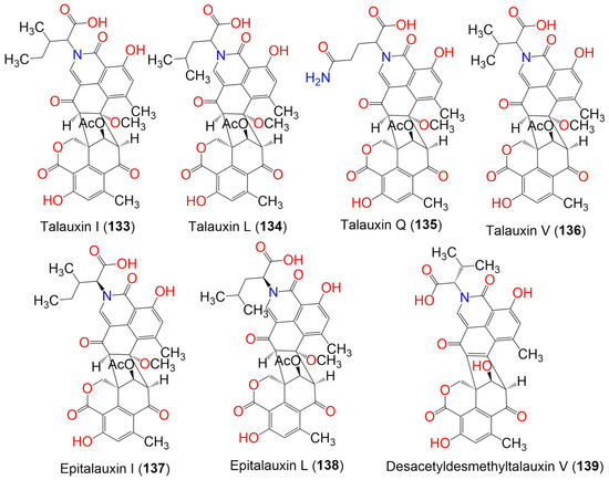 Duclauxin (120), talaromycesone B (122), bacillisporin G (127), and xenoclauxin (131) were isolated from anthill soil fungus Talaromyces sp. IQ-313. They were evaluated for PTP (protein tyrosine phosphatases) inhibitory potential. They inhibited hPTP1B1-400 (IC50 values ranging from 12.7 to 82.1 µM), in comparison to ursolic acid (IC50 26.6 μM. Compounds 120 and 127 displayed the strongest inhibitory activity (IC50 12.7 and 13.5 µM, respectively) [58]. Five new polar pigments, talauxins E (132), I (133), L (134), Q (135), and V (136), along with the previously reported 9-demethyl FR-901235 (55), O-desmethylfunalenone (100), and duclauxin (120), were purified from Talaromyces stipitatus (Figure 14). Talauxins are unusual heterodimers that are produced from the coupling of 120 with amino acids and are closely related to duclauxamide A (119), which was separated from Penicillium manginii [56]. They were fully characterized via spectroscopic and X-ray analysis. Compounds 120 and 132 exhibited weak cytotoxic effectiveness (IC50 140 and 70 μM, respectively) versus NS-1 cells, compared to 5-fluorouracil (IC50 4.6 µM) in the resazurin microplate assay, while 132 also had weak antibacterial potential versus B. subtilis (IC50 265 μM), compared to clotrimazole (IC50 0.4 μM) [49].