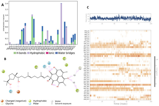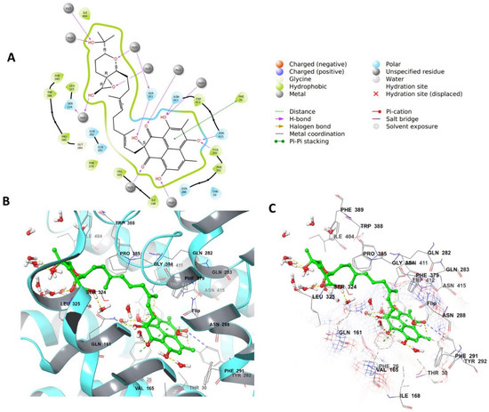 Figure 16 shows the binding interactions of compound 60 after docking. While the Phe26 side chain forms pi-pi stacking with the fused ring system of 60, several H-bonds are formed between the OH and carbonyl groups of the ring system and the amino acids Gln161, Asn411, Asn415, and Tyr292, as well as forming water bridges with the adjacent water molecules. Additional water bridges are formed with the oxygen and OH groups of the substituted tetrahydropyran at the end of the aliphatic chain.