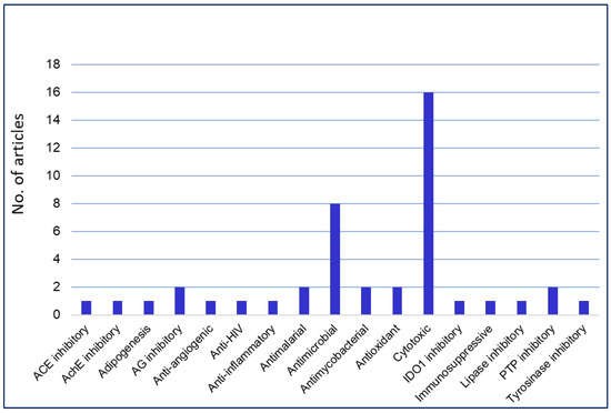 The bioactivities of some of the reported metabolites have been investigated. In this regard, 70 metabolites have been associated with some type of biological action, including cytotoxic, antimalarial, antimycobacterial, anti-inflammatory, anti-angiogenic, immunosuppressive, and antioxidant properties, as well as IDO1, α-glucosidase (AG), ACE, tyrosinase, and PTP inhibition. This information has been discussed and listed in Table 2.