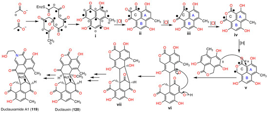 Duclauxin (120) is an oligophenalenone heptacyclic dimer, consisting of dihydroisocoumarin and isocoumarin units that are joined together by a cyclopentane ring. The previously reported labeling experiment revealed that 120 originated from a heptaketide chain, which was cyclized to produce phenalenone (i) [21,61]. A triketone (ii) was formed by the oxidative loss of one of its carbons to yield a contracted ring, C. Its decarboxylation and regio-selective oxygen insertion, induced by enzymes or air, yielded dione (iii) and naphthalic anhydride (iv) [21]. Then, the selective reduction of (iv) generated a lactone (v). The dimerization of two lactone units through oxidative radical coupling between C-8 and C-9′a, which was catalyzed by oxidative enzymes, yielded a biaryl (vi) [62,63]. The latter underwent an intramolecular aldol condensation between the C-8′ and C-7 ketone group to furnish the aldol fragment (vii). The latter could experience a group of successive tailoring modifications in terms of reduction, methylation, acetylation, and dehydration, to produce 120 [56,64]. Compound 119 was assumed to be biosynthesized through ammonolysis, with the aid of one serine as a nitrogen donor and a further serine moiety′s decarboxylation, to provide 119 (Scheme 2) [56].