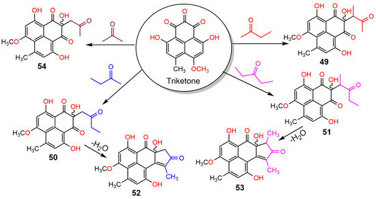 On the other hand, it was hypothesized that the compounds 49, 50, 52, and 54 were artifacts, resulting from the spontaneous addition of acetone or methyl ethyl ketone to the unstable triketone (Scheme 3) [48]. Meanwhile, the use of 3-pentanone as an initial extracting solvent ultimately led to the formation of 51 and 53 [48].