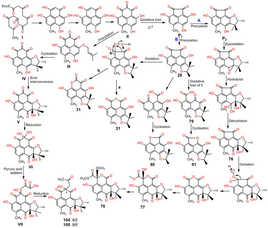 Li et al. proposed a biosynthetic pathway for compounds 21, 28, 31, and 76–81, which have a phenalenone nucleus fused to a trimethylfuran ring [39]. The trimethylfuran ring was biologically related to mevalonic acid [65]. The oxidative loss of C-6 of the heptaketide-derived phenalenone nucleus yielded P1, which could be prenylated in two various paths (A and B), leading to the formation of P2 and 28. The enzymatic epoxidation of the P2 double bond, followed by hydrolysis and then dehydration, yielded 76. The later oxidation produced 77 and 78. Similarly, the oxidation of 28 resulted in the formation of 21 and 31. Compound 28 was a precursor of 79–81 by the oxidative loss of C-7 (80) or C-5 (79 and 81) and then formed a lactone ring (80 and 81) [39]. The linkage of a prenyl side chain to 5-OH of the tricyclic intermediate II was catalyzed by prenyltransferase to yield the prenylated intermediate (III). Additionally, IV was generated from the Claisen rearrangement and cyclization of III [21] (Scheme 4).