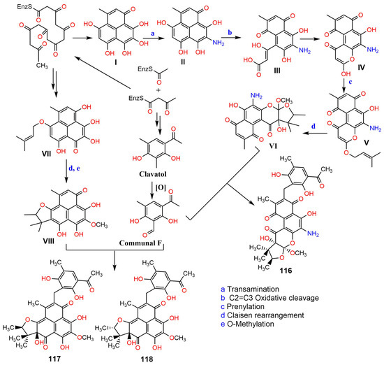 The enol inter-conversion of the C-4 and C-3 of IV generated an intermediate V that was converted by reduction to form VI, which was very active due to the C-8 two hydroxyl groups. Then, pyruvic acid was added to one of the hydroxyl groups to give VII. Finally, 104 and 105 were produced by the VII COOH group reduction, which was catalyzed by reductase [46]. Yu et al. proposed biosynthetic pathways for 116–118 (Scheme 5). The intermediate I was trans-aminated to yield II, which underwent oxidative cleavage to form a naphthoquinone (III) [55]. Then, a benzo[f]chromene-1,7,10-trione derivative (IV) was generated through the cyclization between 7-OH and the 3-carbonyl group. The prenylation of IV, followed by a Claisen rearrangement, yielded VI. The coupling of communal F with VI generated 116 [66]. Furthermore, 112 and 117 were produced from the coupling between communal F and VIII [55].