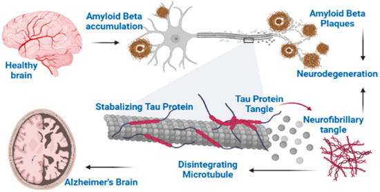 On a macro level, the pathology of AD can be determined as the progressive loss of brain tissues. With the passage of time, the neuron loses its integrity and ultimately dies in a specific way with the disease progression. The first sign of AD is loss of memory, especially the short term memory. The part of the brain concerned with the memory is the cortex and hippocampus [19]. In the entorhinal cortex, which links the hippocampus (involved in the formation of memory) with the cerebral cortex, the AD symptoms start initially [19]. Magnetic resonance imaging (MRI) studies revealed that the loss of neurons begins before the loss of memory occurs. As atrophy occur in the brain tissues, the cerebrospinal fluid (CSF) fills the empty spaces of the brain tissues. The memory loss is more prominent in case of mild to moderate AD. The patient is unable to recall famous names as well as suffers confusion about well-known places. There is a change in the personality of the patient and their mood. Additionally, the patient is unable to perform complex work. After this, the atrophy expands to other areas in the cerebral cortex [19]. As the AD progresses, atrophy occurs in the area of the cortex, which controls sensory processing, reasoning, conscious thoughts and speech, and the symptoms of AD such as long term memory impairment, weight loss, seizures, unable to recognize loved ones, and incontinence become severe [19,20].