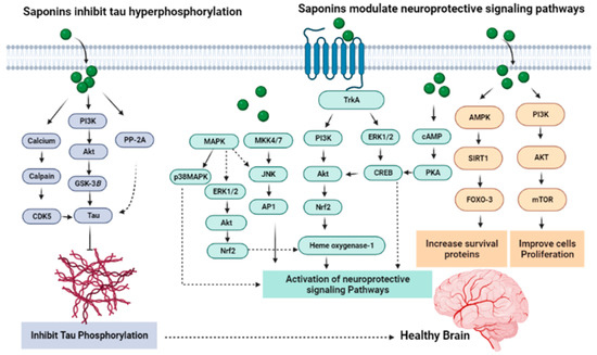 The plant of green tea (Camellia sinensis) is a rich source of various bioactive metabolites including saponins. In a study, pure theasaponin E1 was isolated from the seeds of the green tea plant and was tested against anti-neurodegenerative potentials in AD models [77]. It was found that theasaponin E1 significantly reduces tau phosphorylation. It produces this effect by suppressing as well as reducing the gene expression and different kinase activity that is responsible for tau protein hyperphosphorylation, which contributes to the formation and aggregation of NFTs and is linked with the production of Aβ and the pathogenesis of AD. In this study, cells of SHY-5Y neuroblastomas were used to determine the theasaponin E1 inhibitory activity on tau phosphorylation through inhibition or suppression of the level of expression as well as the activities of different kinases involved in this procedure. Theasaponin E1 was found to decrease the level of gene expression in SHY-5Y neuroblastoma and the in vitro activity of different kinases such as CDK5, GS3β, ERK and CAMII in a dose-dependent manner [77].