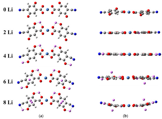 Two Li atoms were added in the first step of reduction, testing three different initial geometries: both Li in one ligand and one Li in each ligand in two symmetries—C2v and C2h. The first one was a singlet with higher energy than the other two. The latter two were triplets and converged to the same planar C2v symmetry as shown in Figure 2. Each Li is coordinated by two oxygens—a quinone and a carboxyl one. The addition of the next two Li atoms resulted in the reduction of the second pair of quinone oxygens with partial involvement of the cyano-nitrogens. Two more Li atoms were located on the carbon rings, their C2h configuration being preferred to the C2v one, and the next two Li occupied the opposite position on the rings. The optimized geometry at this step (8Li) resulted in the loss of planarity, indicating that the maximum addition is reached. Indeed, further lithiation caused decoordination, so the complex was able to accommodate twice as many Li atoms compared to two free ligands. In the process of lithiation, the complex became perfectly planar and from linear turned slightly V-shaped, which resulted in the contraction of its length, measured as the distance between the two nitrogens (Table 1). The length alters due to the opposite effects of the emerging curvature (contraction) and decomplexation of Ni (extension), as shown in Figure 3a, but overall, the length varies insignificantly (3–4%).