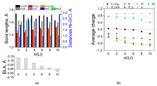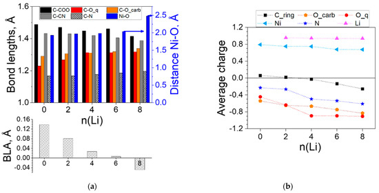 Ni(II)(L1)2 complex: (a) variation in the averaged bond lengths (Ni-O on the right axis) and bond length alternation (BLA); (b) averaged charges upon introduction of n Li atoms. Numerical values can be found in Tables S2 and S3.