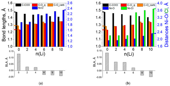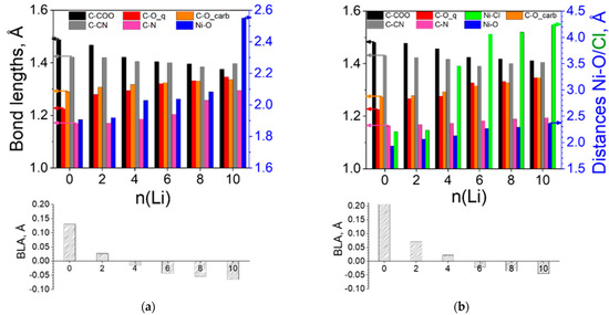 As a result, the length of the elementary unit oscillates within 4% for both polymers (Table 3). Naturally, the length depends not only on the coordination of Ni but on the variation in all structural parameters. As seen in Figure 8, the BLA drops faster in [Ni(II)L2]n due to a faster extension of the carbonyl bond. The growth of the C-O bonds in the carboxyl group, parallel to the shortening of the C-COO bond, indicates that after the aromatization of the ring, new quinoidization takes place, this time in direction of the carboxyl groups. Therefore, the BLA value becomes progressively negative. The Cl− ions serve as ligands up to 4Li and are fully decoordinated from Ni thereafter, which is well supported by the charge values, which grow from −0.4 to −0.9 (Figure 9).