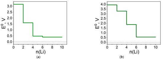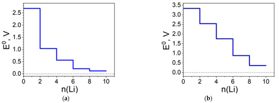 The calculated standard redox potential profiles for the two complexes are shown in Figure 6. For the Ni(II) complex, the redox potential profile clearly reproduces the structural changes and the redistribution of charges with a threshold number of Li (i.e., 4Li). The profile features two distinct plateaus—one of them at nearly 3.3 V and the other at 1.0 V. The first voltage plateau at 3.3 V resembles that calculated for the uncoordinated ligand (Table S1): 3.3 V versus 2.9 V, respectively. In addition, the reduction of Ni(II)(L1)2 with the first two pairs of Li takes place at very close potentials, this behavior being typical for para-BQ derivatives interacting with Li [49]. All these features signpost once again that Ni(II) does not take part in the redox reaction. The abrupt decrease in the redox potential from 3.3 V to 1.0 V is associated with an accommodation of extra Li, surpassing the uptake of the uncoordinated ligands. Instead of Ni(II), it is rather the quinoid ring carbons that take part in the further redox reaction (Figure 3b).