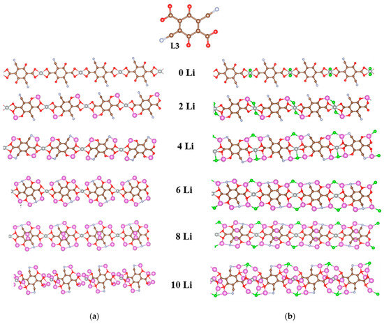 Optimized geometries of the step-by-step lithiated coordination polymers of (a) Ni(II) and (b) Ni(IV) with 2,5-dicarboxylato-1,4-quinone (L2). Color code: C—brown, H—white, O—red, Ni –gray, Cl—green, Li—pink.