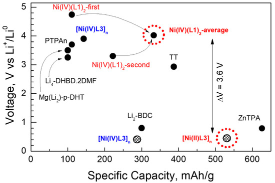 The comparison shows that the Ni(IV)-bearing organic compounds display higher redox potentials than their Ni(II) counterparts. This is a consequence of the more effective participation of Ni(IV) in the redox reaction with Li than Ni(II). Moreover, the Ni(IV)(L1)2 complex exhibits an initial redox potential of 4.7 V, which is among the highest potentials reported for organic compounds (Figure 15). The specific capacity delivered at this potential is also significant (111 mAh/g). It is noticeable that, at the second step, Ni(IV)(L1)2 also has promising properties: it delivers a much higher capacity (i.e., 222 mAh/g) at a redox potential which is still high (i.e., 3.3 V). Taking into account the first and second redox steps (Figure 6b), an average redox potential of 4.0 V and a specific capacity of 333 mAh/g are estimated. For the sake of comparison, one of the best organic cathodes, namely triptycene tribenzoquinone (TT) with a 3D structure, provides a specific capacity of 387 mAh/g at a redox potential of 2.9 V [49].